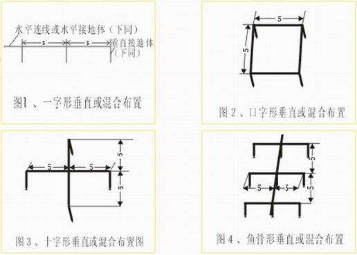 如圖1-4,分一字形、十字形及魚(yú)骨形。特別要指出的每根垂直接地體之間的距離不應(yīng)小于5米,否則有屏蔽作用,降低降阻效果,此方法僅在垂直接地體周?chē)聪聢D(垂直接地體的埋設(shè))施用降電阻劑,此法適用于地形狹窄,但能深挖或有條件使用機(jī)械鉆孔的情況。
