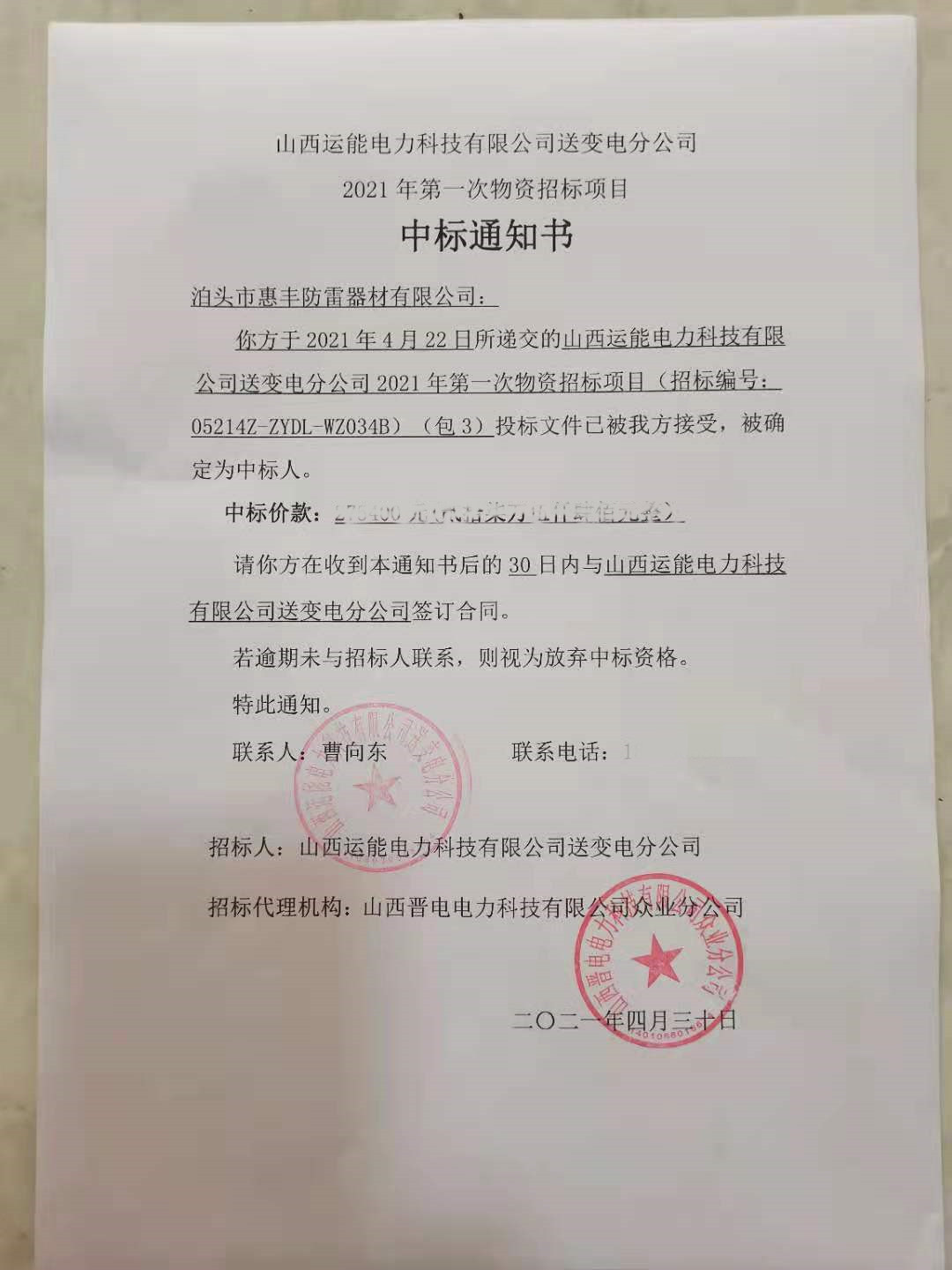 運(yùn)城垣曲縣松樹嶺110KV輸電變電工程王茅-松樹嶺110kv線路工程乙供材物資采購。標(biāo)號:05214-zydl-wz034b惠豐公司中標(biāo)。此次采購的接地材料包括40*5石墨接地體,40*6*3000鎧裝引下線,水平連接件,16*55的螺栓。中標(biāo)通知書如下: